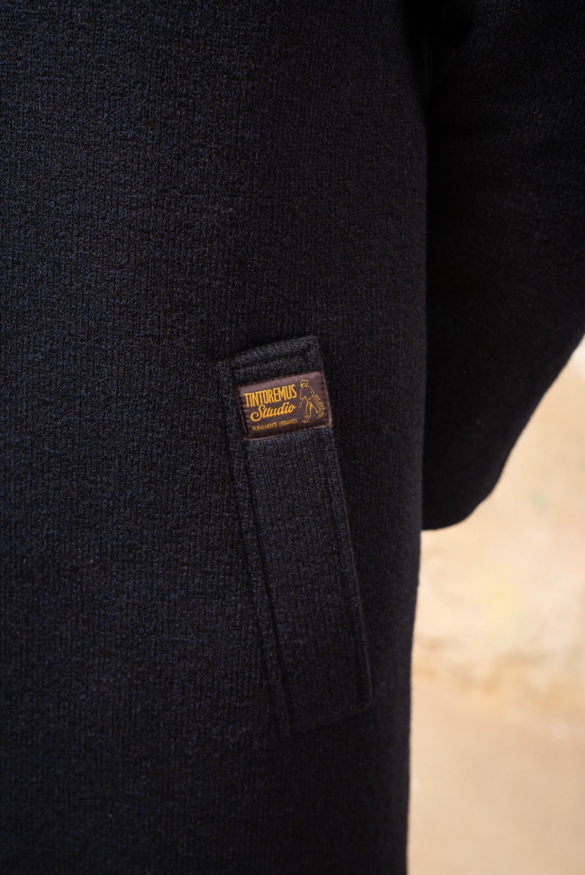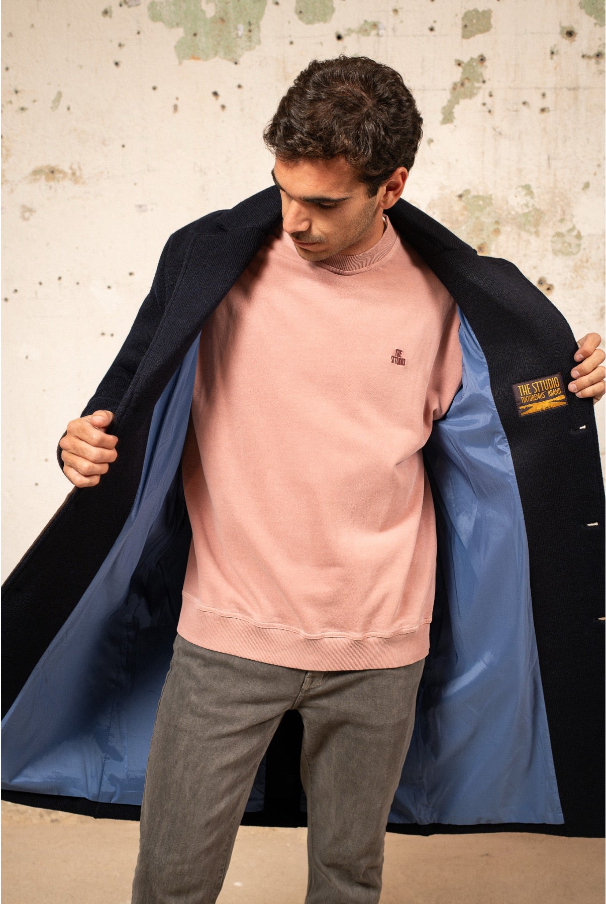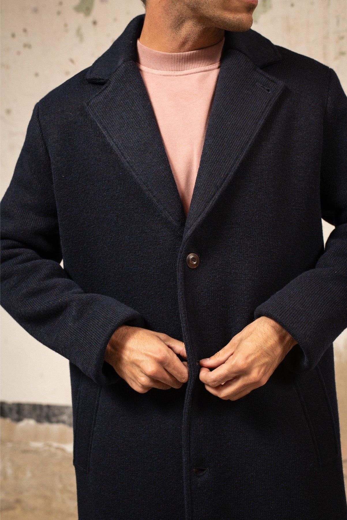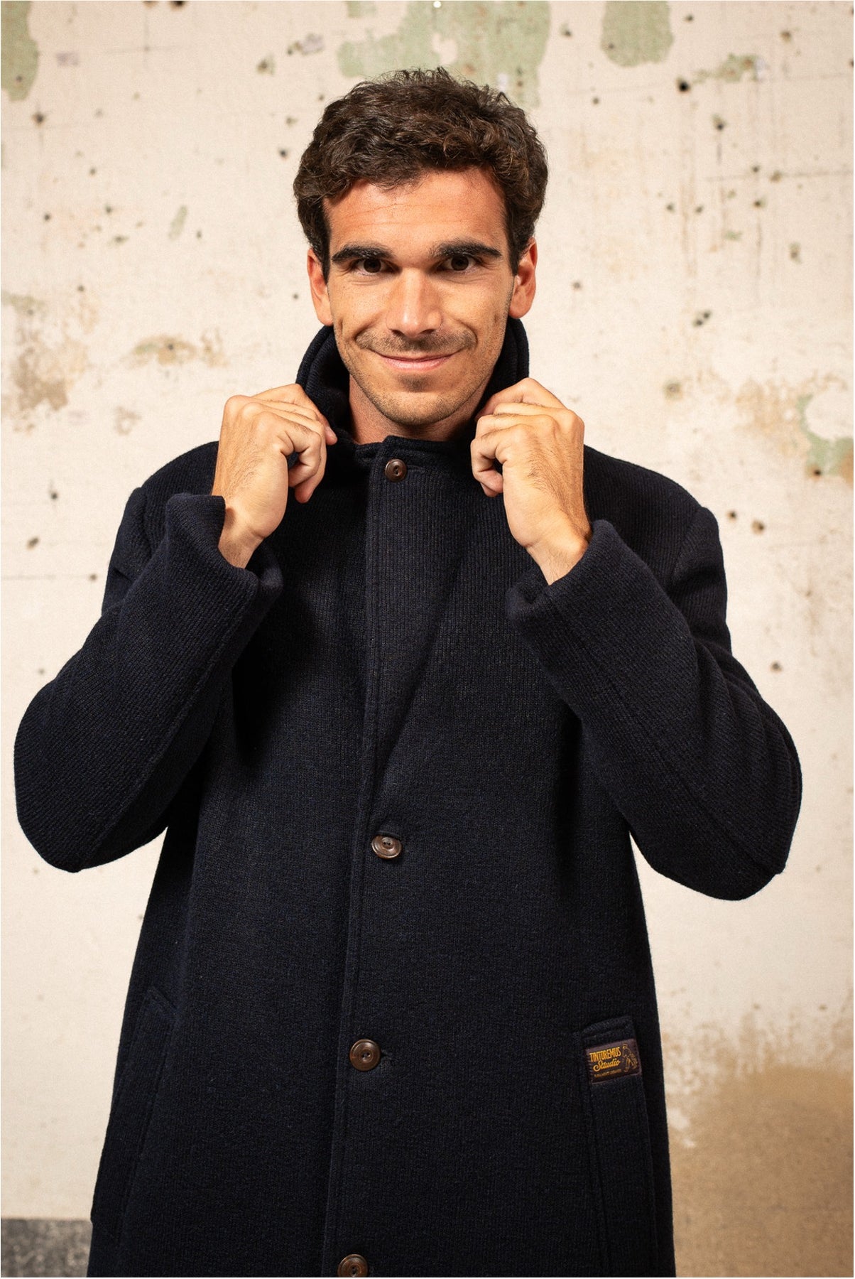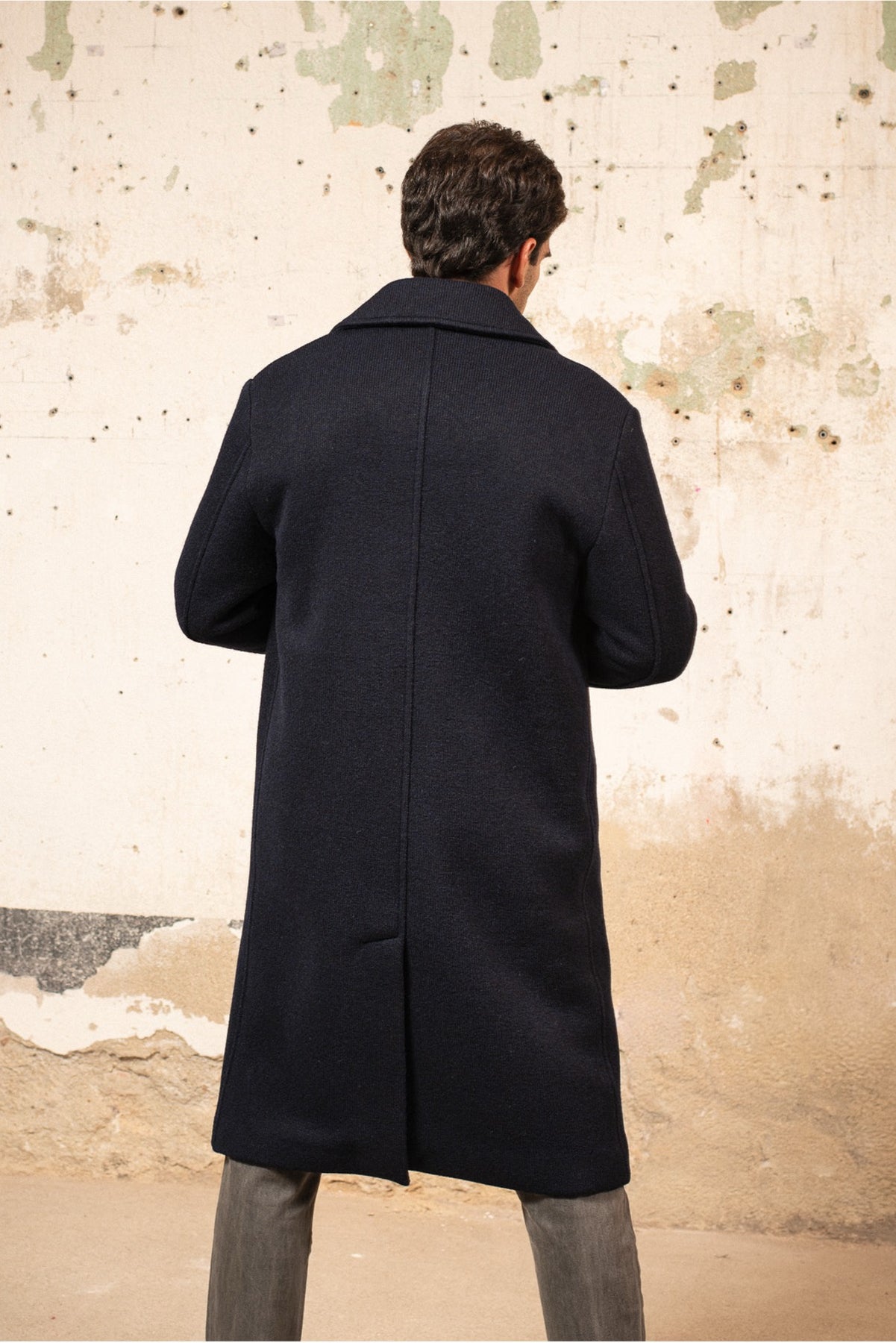 DARCY, es un abrigo largo hecho con 58 % lana 42 % poliéster reciclado y un forro 100% algodón.