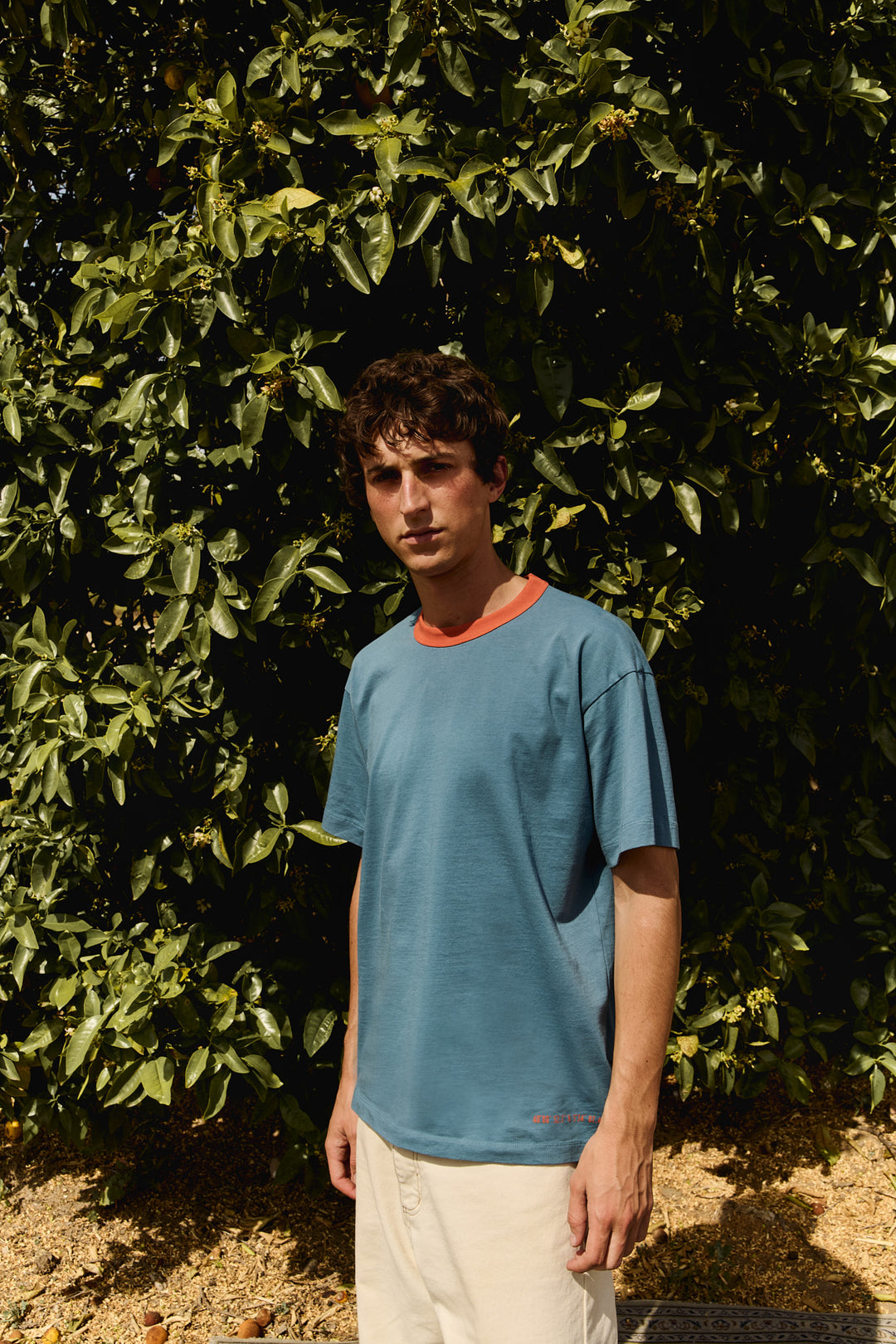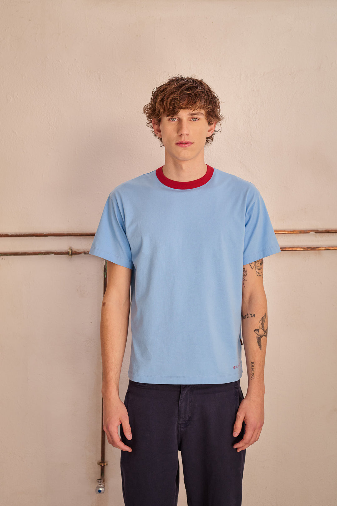 La camiseta de algodón orgánico es el punto de partida de cualquier look de la colección. Sola, con los pantalones chinos o denim de Tintoremus Sttudio. Debajo de las sobrecamisas o chaquetas de la misma línea. El corte limpio y la paleta natural hacen que funcione igual un sábado que un lunes.