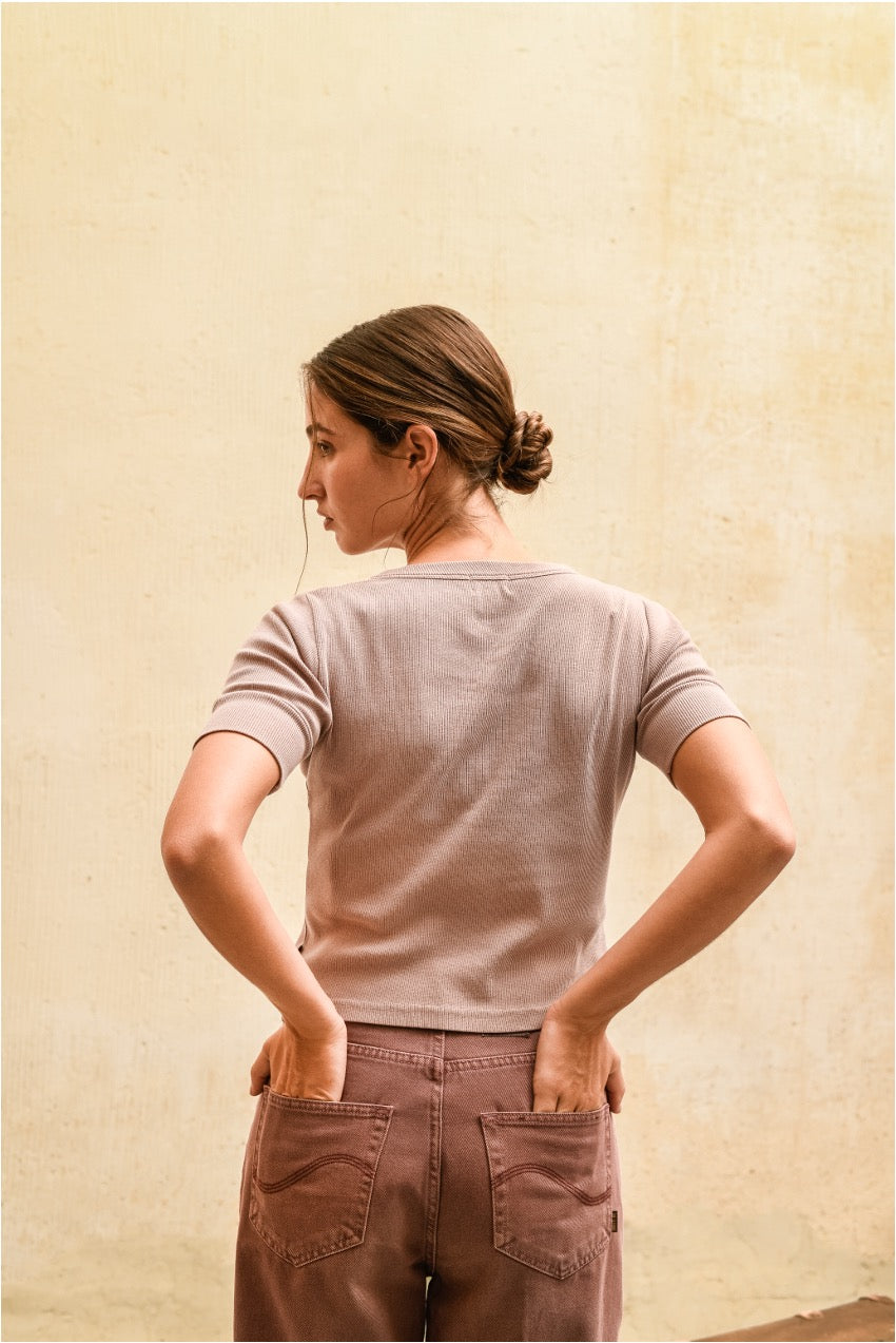 LUCRECIA, es una camiseta hecha en 99% algodón 1% elastano , en canalé y corte entallado con cuello redondo con botones.