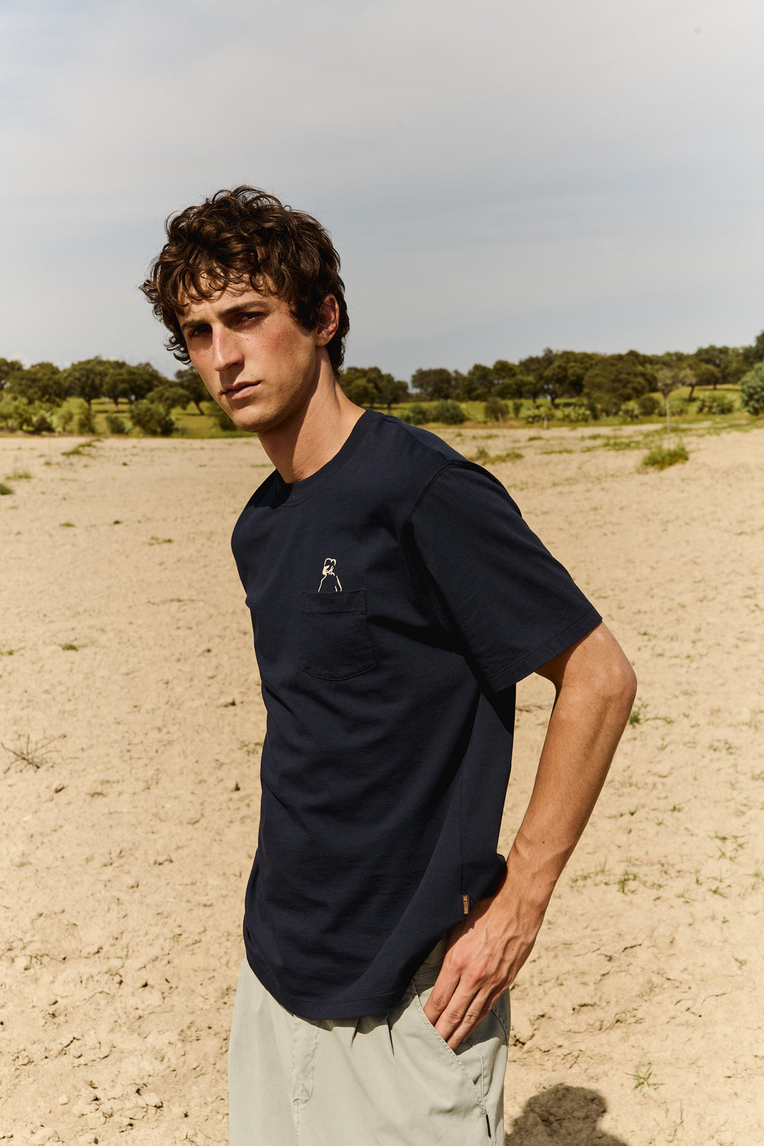 El tejido base de toda la colección de hombre es algodón 100% orgánico certificado GOTS. El color proviene exclusivamente de pigmentos naturales: el azul y los grises del índigo, los ocres de otros tintes vegetales cultivados en España.