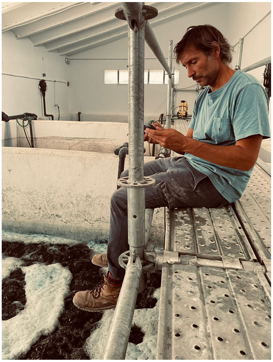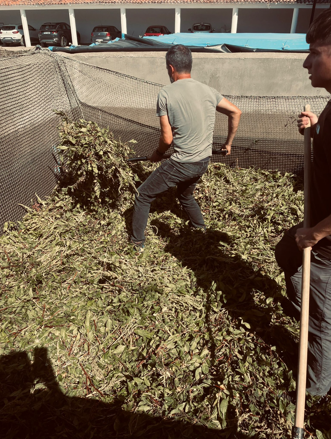 Sacamos las hojas de las piscinas de fermentación, estas pasan a ser compost y trasladamos el agua "sobrante" a nuestras piscinas de oxigenación, es en este momento, cuando comenzamos el proceso de oxigenación de la mezcla fermentada.